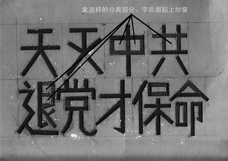 找硬纸板,上面写上选好的标语(或打印机打印好贴上),字大一些比较引人注目。使用壁纸刀将字刻空。中间会有刻掉的部份,找纱窗,剪下一块,在背面用万能胶沾上,然后将掉下去的部份用万能胶粘在纱窗上。做好的样子如附件所示:实际尺寸大约26×15cm。