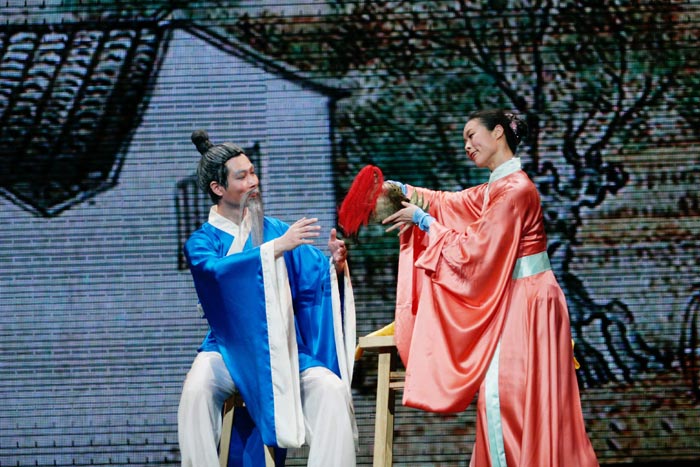 表演剧“红眼石狮”讲述了传统的善恶有报故事。村里善人敬神爱人,恶人自大放肆。善心婆婆救助观音大士化身的乞丐,九霄瑞霭散缤纷,祥瑞金光护法身,菩萨现身告诉婆婆石狮眼睛变红时要赶快离村。婆婆马上把消息告诉村人,信者告谢离开,不信者嘲讽耻笑,人的一念决定了自己的未来。