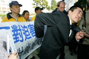 【明慧网2006年1月25日】美联社2006年1月24日刊登摄影记者Jeff Chiu的图片报导,报导法轮功学员于当天在旧金山中领馆举行的新闻发布会。会上,法轮功学员查尔斯-李(李祥春)用亲身经历揭露中共的