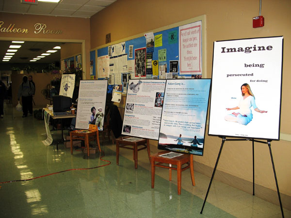 自上午11点到下午5点,讲真相的桌位设立在餐厅入口行人繁忙地段。大量的学生和教职员工了解到中共是如何邪恶的迫害法轮功。一台电视机播放真相光盘,吸引了很多行人。大家分发了几百份真相传单,许多人在餐厅里边吃饭边阅读传单。读过真相材料后,很多人表示支持法轮功并为能够了解真相表示感谢。值得一提的还有大赦国际学生支部义工们的贡献。他们安排了这一活动并且帮助分发传单和解释迫害真相。