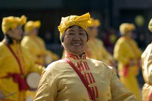 ![]() 法轮功腰鼓队的击鼓手 |