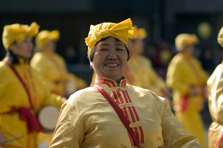 参加游行的社团华裔和韩裔占了一多半,也有菲律宾及马来裔等团体,可谓是和谐喜气各族同庆。许多人穿上了节日的盛装,表演出最拿手的绝活,观众目不暇接,时时报以热烈的掌声。在所有的参加游行的队伍中,法轮功学员的方阵无疑是最光彩夺目的。队伍中有军乐队、仙女队、炼功队和腰鼓队,整个队伍绵延近四个街区。特别是首次亮相的法轮功军乐队(Marching Band)引来人们连连赞叹,许多华裔观众不断的鼓掌、叫好,还有的兴奋的举起大拇指表示称赞,有的华人观众还兴奋的将双手举过头顶来鼓掌和叫好。一位亚裔观众对记者说:这些年法轮功经历了许多魔难,但他们做的很好,很平和。