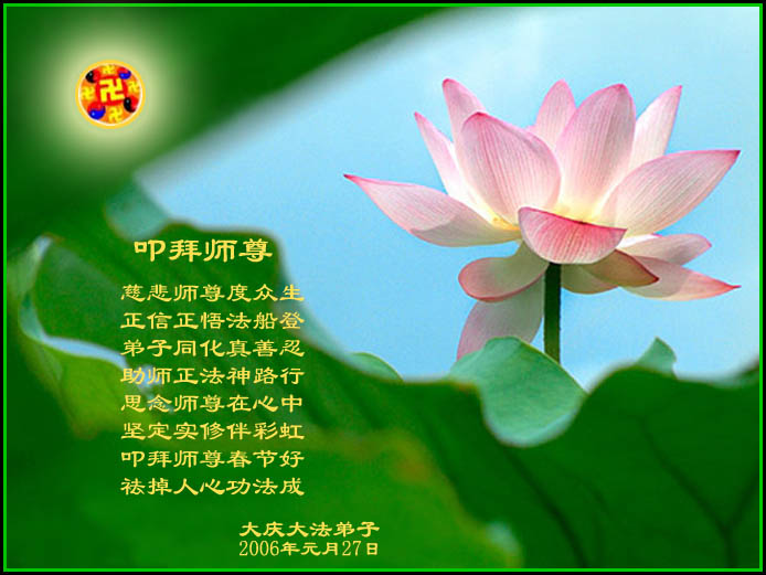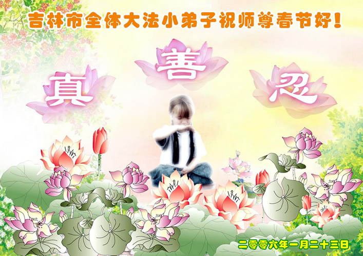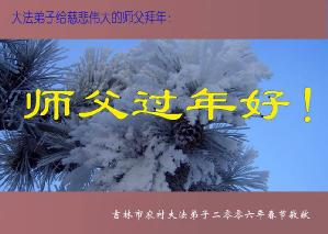 我们是吉林市大法弟子(新弟子),我们老俩口是2005年3月27日得法开始修炼的。得法前我是个酒徒,我的老伴身患可怕的多种疾病,修炼后老伴病都痊愈了,我也戒掉了46年的酒瘾,这是尊敬的师尊给予我们第二次生命!感谢伟大的师尊,感谢大法!我们老俩口诚挚的向伟大的师尊过年问候,祝师尊过年好!