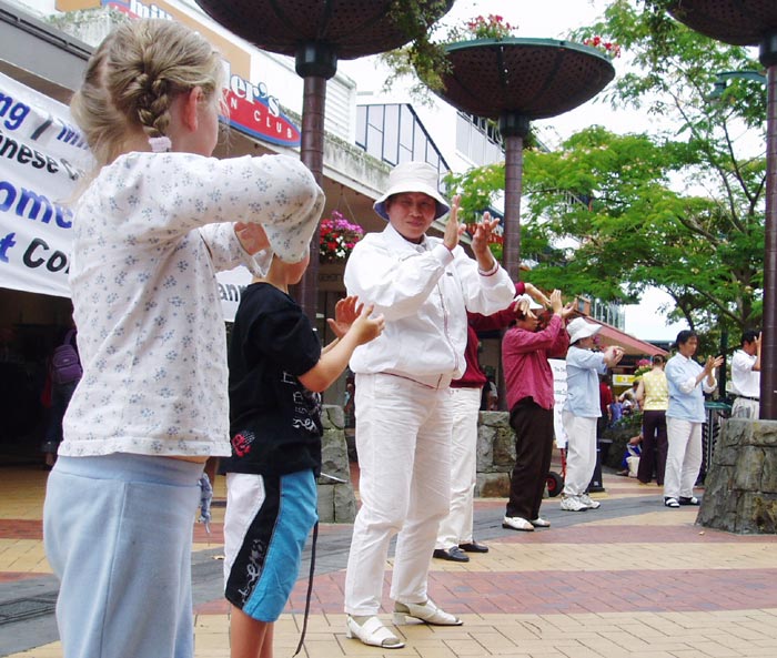 一对西人小姐弟俩在一旁妈妈的注视下还认真的跟随法轮功学员学炼功法。