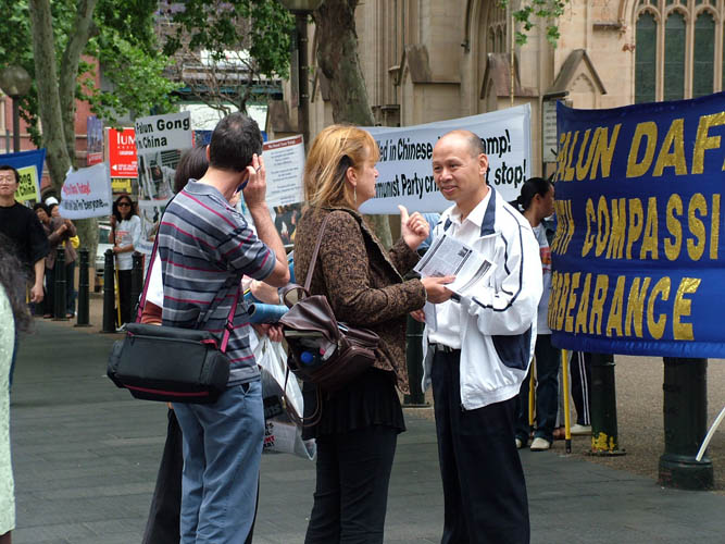 讲真相的法轮功学员分成三组,发“九评”、促“三退”(退出中共党、团、队),有不少侨胞当场声明“三退”,还有的侨胞要求学法轮功。有位来自黑龙江的残疾老人说:“我恨透了共产党,我忘不了文革时受的迫害,我的身体就是那时候被打残的。”