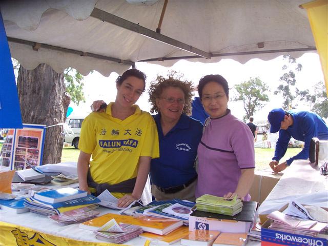 ![]() 法轮功介绍摊位上的真相资料和义工 |