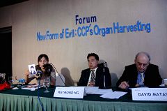 ![]() 陈劲(左一)在大卫•麦塔斯访马演讲期间讲述她在中国被迫害的经历 |