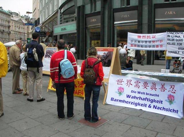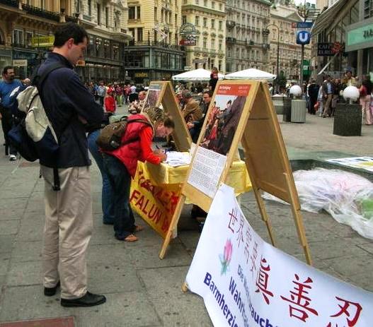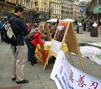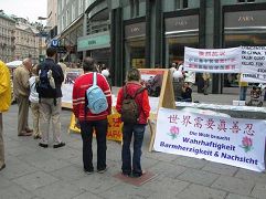 在施蒂凡广场到处是来自世界各地的人们,也有不少中国旅游团。很多的西方人和中国人对着横幅和展板拍照。尽管部份展板只有中文的文字说明,它们还是吸引了很多西方人的目光。活动引起了很大的关注,信息摊位的访客络绎不绝。法轮功学员展示的舒缓的五套功法也给人们留下了深刻的印象。在发资料的同时,不少学员与路人之间进行了颇为深入的交谈。很大部份的路人被中共侵犯人权的残酷暴行震惊。许多人以前不知道在中国发生的这些事情。