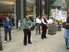 ![]() 行人在法轮功的摊位前驻足观看 |