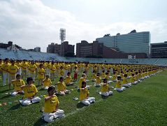 这次到场表演的学员约有一千四百多位,队伍前方由一排男学员手持“法轮大法”的宝蓝色大旗,气宇轩昂,学员们整齐浩大的队伍,庄严祥和的神态,一出场就气势不凡!优美的音乐与整齐的动作,使得运动会原本喧嚣热闹的气氛也顿时跟着沉静下来,只听到法轮功炼功音乐如同天际传来的声音,将整个运动场罩在祥和的氛围中。