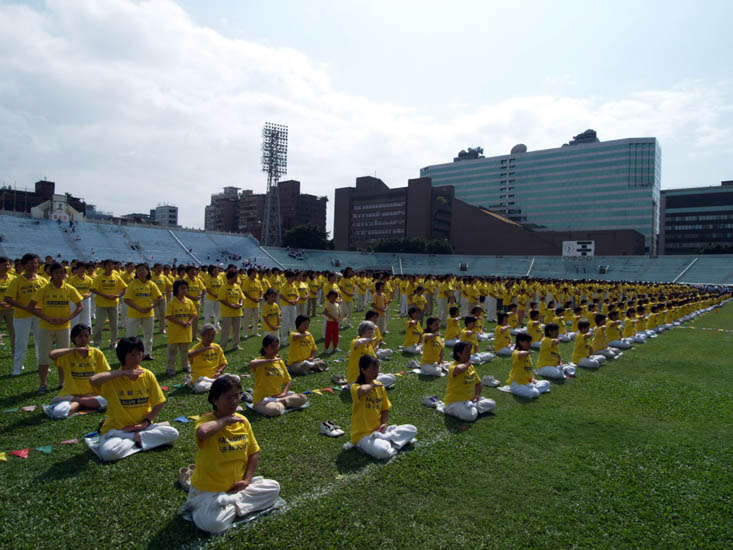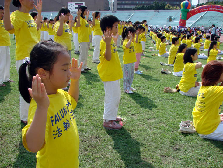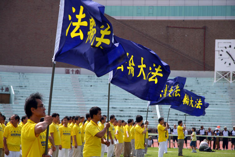 当天早上风和日丽、艳阳高照,与会嘉宾、立委、团体、与台北市民们络绎不绝。运动大会一开始,便由气势磅礴的“新唐人旗鼓队”开场,只听威武雄壮的鼓声震撼天宇,只见壮丽飞扬的旌旗扫荡阴霾,在场来宾不禁专注观赏并不时给予热烈掌声。法轮功学员的五套功法表演则担任运动团体的压轴演出,在等待的期间,即便是烈日当头,学员们也安静、整齐的等待表演开始。