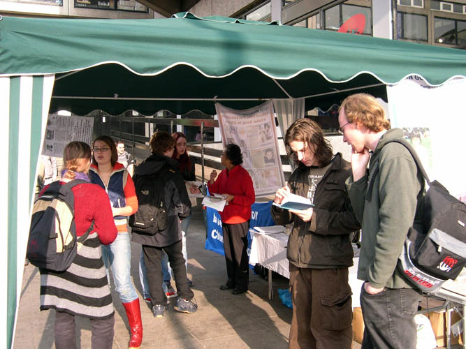 ![]() 在国际大赦学生小组的帮助下,法轮功学员在格拉斯哥大学讲真相、征签 |