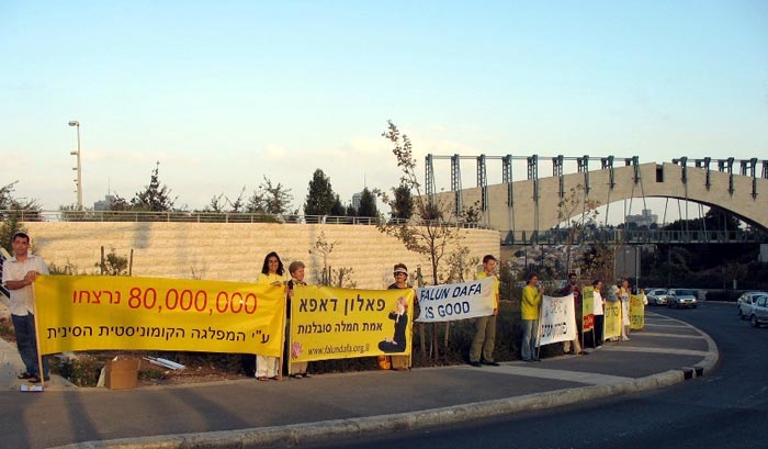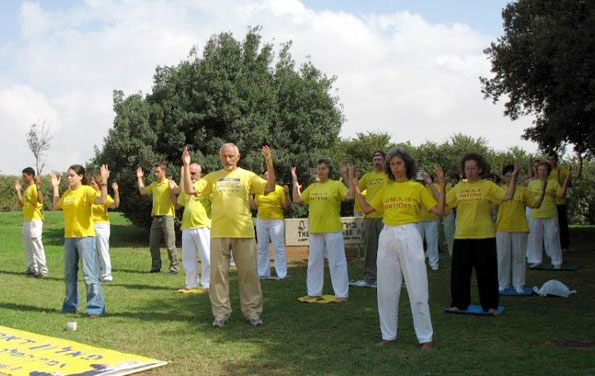 十月十九日清晨,学员们在以色列议会大楼对面的公园里演示了五套功法,向参观议会大楼的游客散发了真相传单。