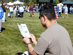 一位先生问,为什么在如此严酷的环境下还要坚持修炼。了解真相后,他满意的拿着有关中共活摘法轮功学员器官的资料离开了。