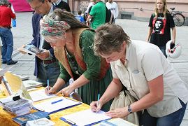 一位女士推着孩子路过这里,被这一幕惊呆了。“他们(中共)疯了,一个人怎么能会对另外的人做这样的事”。她来到展台前激动的说:“我能为他们做些什么?”她在签字本上郑重的签下了她的名字。