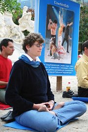 ![]() 大法学员向民众演示法轮功祥和的功法 |