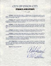 十月四日,美国加州联合市市长和副市长代表市政府向法轮功学员颁发决议书,决议谴责中共对法轮功学员的迫害,敦促各国政府对法轮功学员所遭受的暴行进行调查;决议并敦请各国政府为使迫害结束采取所有必要的措施,同时要求中共释放人权律师高智晟。
