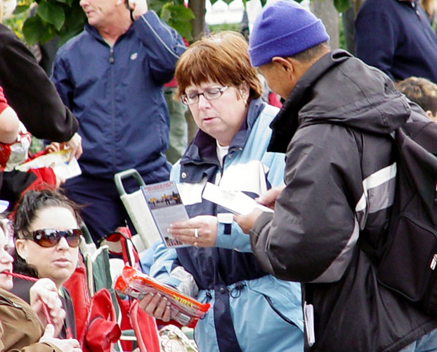 ![]() 丁先生向观众们发放法轮功真相资料 |