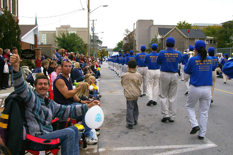 沿途观众看到法轮功乐团的到来都很惊喜,有人跟着节奏给打拍子;有人欢呼:“欢迎多伦多军乐团”;还有西人用中文对着队伍喊:“你好!”一名观众大声对笔者说:“这么多年来第一次看到中国人参加游行,他们做得很好。 ”