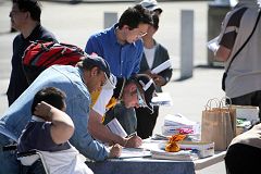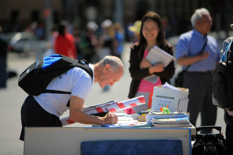 活动中,学员们广发“九评”及活摘器官真相传单,过往行人看到图片上所记载的中共执政后的杀人记录,非常震惊,停下脚步来与学员交谈。一名西人说,自己刚从中国旅游回来,对中国印象还不错,虽然知道中共在过去犯过很多罪恶,但可能也有進步吧。今天了解了活摘器官的真相,才知道中共真的是没救了,在虚伪的繁荣外衣包裹下的都是屠杀、谎言和泯灭人性,中国人太可怜了,一定要救他们。当他问到该如何帮助时,学员递给他一张征签表,他痛快的在上面签了名。