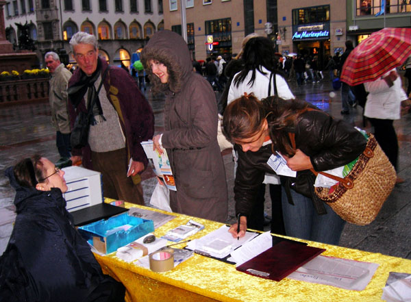 活动现场特别引人注目的是揭露中共残酷迫害法轮功学员的图片展板及揭露中共活摘法轮功学员器官暴行的横幅。人们被暴行震惊了,纷纷签名,要求德国政府不能装聋作哑而要谴责中共的暴行。