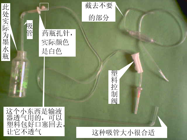 2、制作办法:按需要的长度将输液管截短,将拆下的两头部份再按原样接回截短的输液管上,保证各连接处严密不漏气,再将吸管弯折后短的一头接在输液器的扎药瓶针上,同样要保证严密性,并记得将用来透气的小零件的口用剪下的小块塑料食品袋包上两层后塞回原输液管药瓶扎针上,这样一个密闭的注墨输液器就做好了。取下墨水瓶瓶盖,在上面打一个能轻松穿过吸管的圆洞,备用。