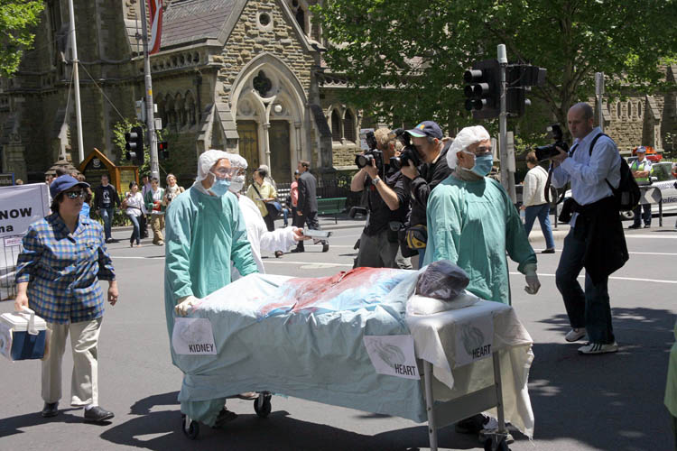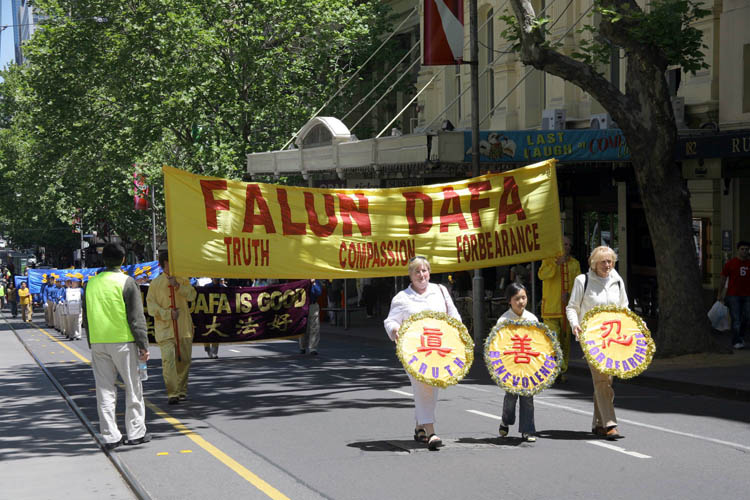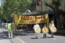 值得一提的是,负责保护游行队伍、维持交通的两位墨尔本警察,在游行前听学员介绍了法轮功被迫害的情况、大法洪传世界八十多个国家和地区、以及此次游行的目地,他们也在请愿书上签名,并主动提出和上级协商,改变路径,使游行经过各大媒体守候的酒店旁,这样主流媒体都能看到法轮功学员的游行,看到大法的真相横幅和揭露迫害的真人模拟演示。