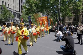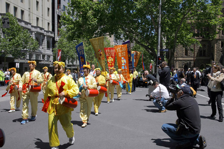 远道而来的悉尼“天国乐团”以雄壮的乐声开道,他们的表演震撼人心,在经过举办G20高峰会的酒店时,聚集在那里的主流媒体的摄影摄像记者,纷纷将镜头转向乐团和游行队伍,法轮功游行成为高峰会前夕的亮点。