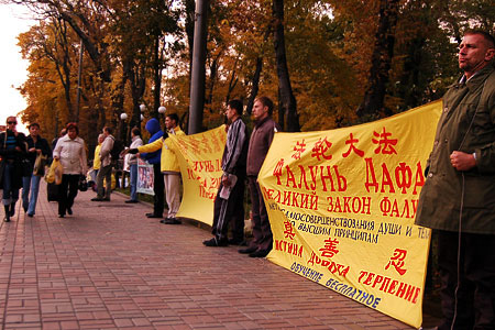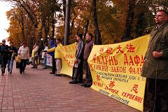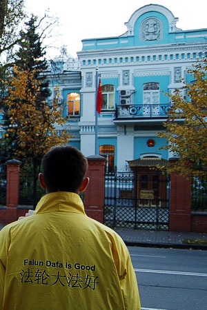 为抗议贾庆林对法轮功的迫害,十月二十七日,基辅的法轮功学员在中使馆对面举行了抗议行动。抗议者表示贾庆林参与了对中国法轮功学员的虐杀、酷刑迫害和群体灭绝。