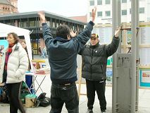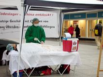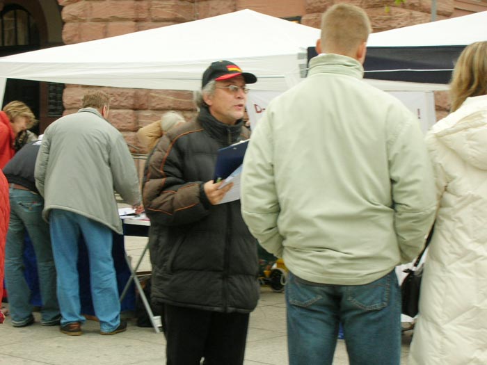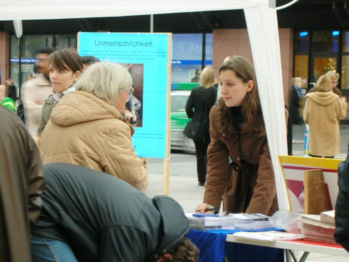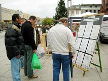 展台一搭好,立刻围过来很多想了解真相的民众。在酷刑展前,模拟手术台前,很多人停住了脚步,静静的观看。当学员用麦克风解说“法轮功是什么”,“99年后遭受了中共的种种迫害”,以及“最近揭露出来的活摘法轮功学员器官的邪恶行径”后,有人惊的目瞪口呆,有人当场指出这是法西斯行为,有人自言自语道“希特勒、希特勒”。了解真相后的人们,大多到展桌前签名,要求制止中共迫害,无条件释放大陆法轮功学员王晓艳(德国留学生张震彤之妻)。也有不少人鉴于中共如此恶劣的人权现状而签名抵制二零零八年奥运会在北京举办。另外,对法轮功有兴趣并表示想学的人也不少,有人当场就跟学员开始学功。