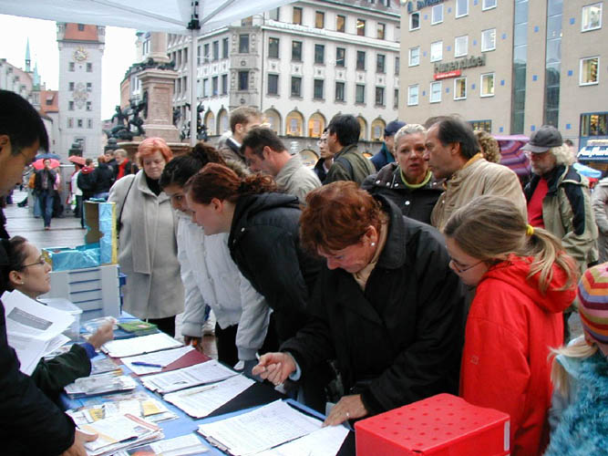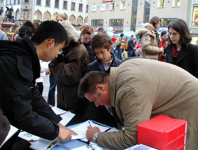 在《九评》发表两周年到来之际,连续三周以来,每周六法轮功学员都在慕尼黑马琳广场举办这样的活动,吸引了无数市民和游人关注。人们纷纷谴责中共对法轮功的迫害,很多人当他们得知法轮功学员征集签名,呼吁德国政府制止中共屠杀法轮功学员时,马上踊跃签名。