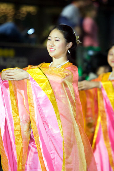 之后是法轮功学员精心制作的巨大灯笼的花车,上面有学员坐在莲花座上演示功法,有的学员不断向沿途观众招手致意,「真善忍」三个大字在大灯笼灯光的辉映下醒目耀眼。