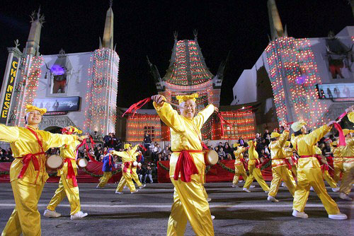 ![]() 刊登在洛杉矶时报好莱坞巡游专刊头条新闻图片。图注中说:来自洛杉矶、圣地亚哥、及旧金山的法轮功学员舞蹈表演者在Grauman's 中国剧院前。 |