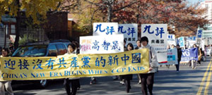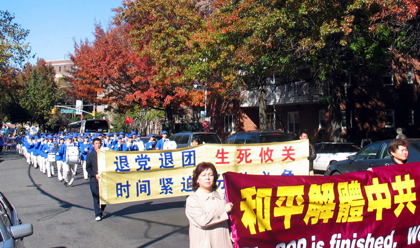 此次声援活动由大纽约地区退党服务中心、全球审江大联盟等团体联合举办。游行队伍在法拉盛热闹的公立图书馆前集合,金狮开道,蓝底白字的中英文大横幅“声援一千五百万勇士退出中共”气势非凡。游行队伍浩浩荡荡,舞狮、乐队、各式各色横幅、腰鼓,走在法拉盛繁忙的马路上,气势恢宏,吸引了众人的目光。不少华人赶紧拿出随身携带的相机、摄像机拍摄,留下这宝贵的历史一刻。