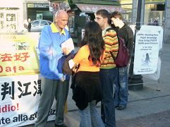 二零零六年十月二十八日和二十九日,法轮功学员在米兰市中心的但丁街举办为期两天的讲真相活动,揭露中共活摘法轮功学员器官的恶行。