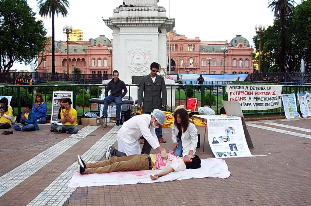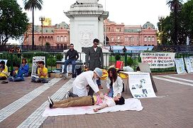 下午在总统府前揭露中共活摘器官的模拟演示及烛光守夜活动也没有被天气干扰。所预告的雨由温暖的阳光代替了。法会后的星期日,在中国城讲真相的活动也是一早大雨。可是学员早上在公园炼功、发正念时,雨突然停了,并且出来了太阳。因为天气的转变,到中国城买东西的各地华人特别多,很多人看到法轮功学员炼功都特别的停下观看。法轮功自一九九九年七月开始在中国被迫害,很多人都没看过法轮功的功法。阿根廷法轮功学员很难过的表示,他们为那么多不能修炼这么好的大法的中国人感到悲哀,也为那些到了外国还怕中共、不敢炼功的中国人感到可惜。这证明了中共的疯狂恐怖的程度。