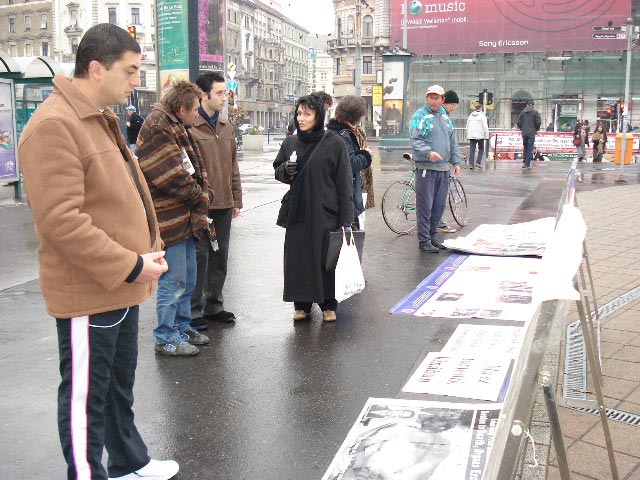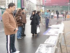 学员们摆出真相图片,发放传单,征集签名,并和路人交谈,讲述中共对法轮功学员犯下的人权罪行。许多人停下脚步认真倾听,或阅读真相图片。