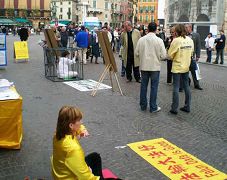很多行人都驻足观看,认真阅读真相展板和横幅,了解在中国发生的持续了七年的对法轮大法学员的迫害情况。在学员们真人模拟酷刑展前,人们停下来,默默的看着,思考着。许多人郑重的签下了他们的名字,呼吁制止中共迫害。