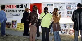 参观者了解了真相后很多都在制止迫害法轮功的声援簿上签了名。有一对情侣观看法轮功学员受中共酷刑折磨的图片时,女孩伤心的哭了起来,她说:“怎么会发生这样的事情,太残忍了。”这两个年轻人都在呼吁制止迫害法轮功的声援簿上签了名。