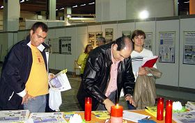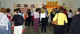 ![]() 法轮功的展位前围满了来了解真相的人们 |
