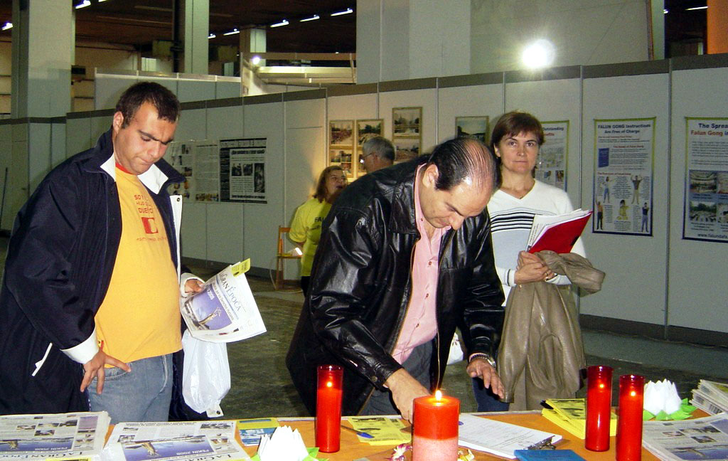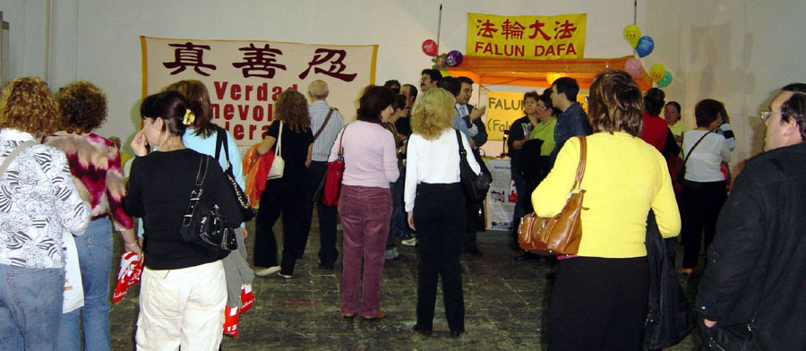 法轮大法的展位上悬挂着中西文的“法轮大法真善忍”巨型横幅,电视里播放着法轮功真相节目和教功录像,“普度”“济世”的音乐回响在展厅里。一位参观者被大法慈悲祥和的能量场所感动,她对学员说: “你们这里就象是另一个世界。”