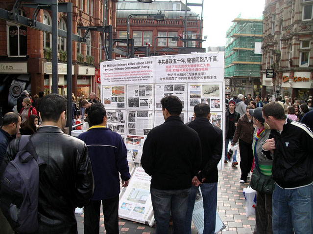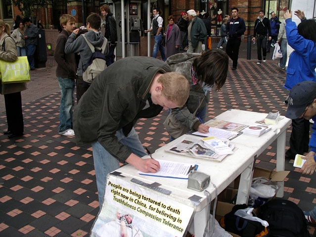 许多路人在展板前停下了脚步,震惊的看着法轮功学员遭受中共酷刑迫害的图片,这些触目惊心的折磨手段包括以竹签钉手指、水牢等等。在阅读内容说明后,人们自发的在呼吁终止迫害的请愿书上签名。这些请愿信将会被递交给英国政府,以促使制止中共非法侵犯人权的暴行。