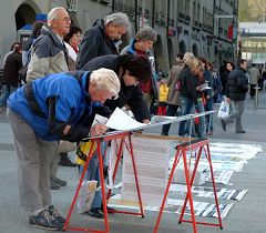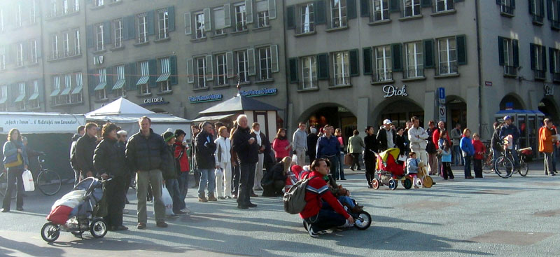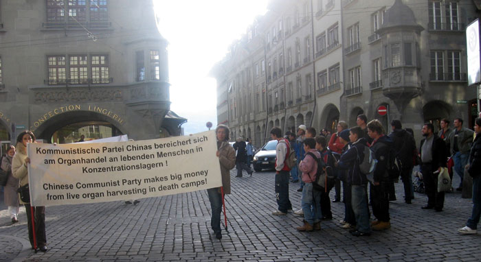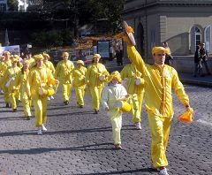 远远的就可以听见整齐的腰鼓声,间或穿插着阵阵“Schnell, Schnell,Schnell, aus der KPC(快,快,快,退出中共)”的呼声,没有激烈的口号,也没有喧哗嘈杂,和其它的游行队伍截然不同。很多漫步在瑞士首都伯尔尼市中心购物街的路人停下了脚步,首先映入眼帘的是醒目的德文大横幅——“一千五百万中国人退出中共”,随后就是身着金黄色中国传统服装的腰鼓队。伴随着优美的“法轮大法好”的歌声,四位女士边舞边行。紧跟着的是写有德法双语的横幅——“停止迫害法轮功”,上面还印着四位法轮功学员静静打坐的祥和场景,及在天安门广场上法轮功学员被中共警察殴打的照片。