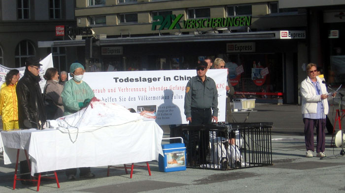 在游行的终点万森豪斯广场(Waisenhausplatz)上的信息摊位早已布置好并开始了。广场的三边展出的是法轮功学员遭到中共血腥迫害的照片和关于九评具体内容的简介。 游行队伍到达后,一个简易的“手术台”出现在广场中心,游行队伍中的那位“医生”开始模拟演示。旁边是一个矮小的笼子,一个“中共警察”将法轮功学员推搡進去。