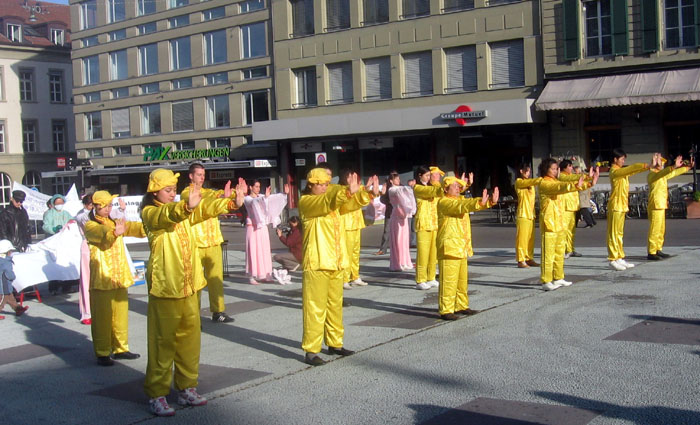 祥和的功法源于中国,但如今在中国却被禁止。信息发布会的最后是功法演示,随着优美的炼功音乐,法轮功学员向人们展示了五套缓慢圆的功法,安德列向路人讲解了每一套功法的特点,以及在伯尔尼当地集体炼功的时间和地点。同时也再次请人们关注在功法演示的后面,法轮功学员模拟的中共活摘人体器官的罪行正在中国发生着。腰鼓队和四位跳莲花舞的女士再次为路人展示了中国传统文化的神韵。
