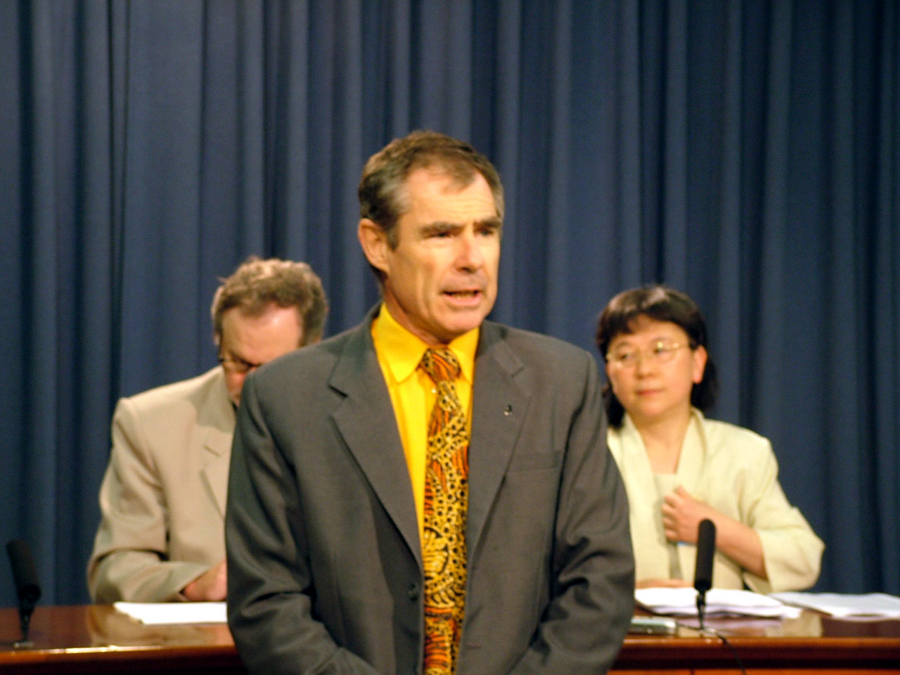 ![]() 澳赴大陆真相调查团纽省分部的负责人,亚当赖斯中心的执行董事格兰德林先生在纽省议会大厦内举行新闻发布会 |