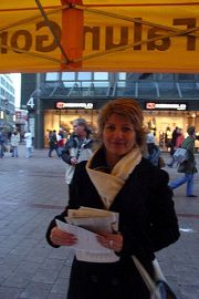 一个年轻女子和她母亲刚好路过,就在表格上签了名。“我经常见到法轮功。温家宝来汉堡的时候,你们在市政厅前抗议迫害,我也在旁边。此外我观看了你们在文化节的嘉年华游行,你们游行花车上的酷刑演示是相当震撼。”