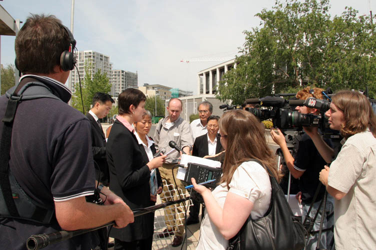![]() 法轮功发言人凯•吕贝卡(左)和原告之一的法轮功学员戴志珍(中)及其法律助手牛顿(右)步出法庭 |