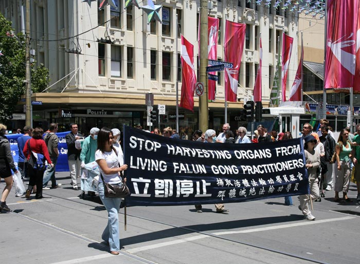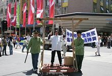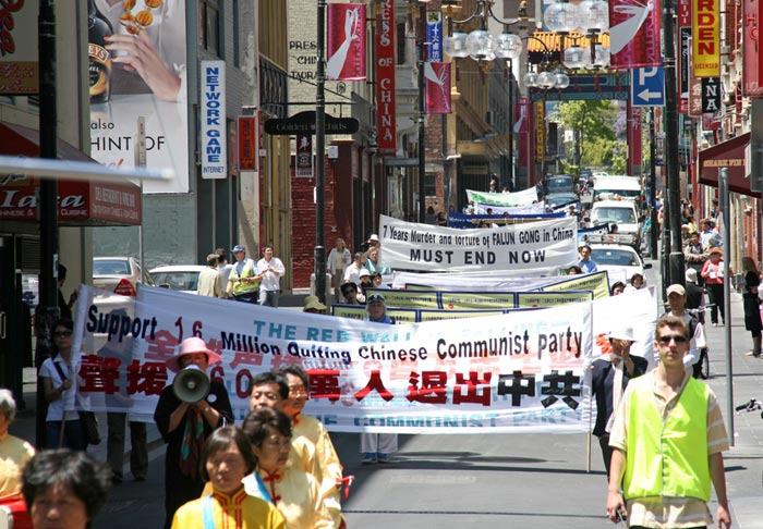 圣诞前夕,南半球的气候和煦宜人,在回响全城的赞美音乐声中,游行队伍手持巨型横幅,腰鼓喧天地穿越闹市,“没有共产党,才有新中国”的嘹亮口号声令人振奋,象是在向人们做辞旧岁迎新年的宣告。游行后,在城市广场举行了大型集会,奥运奖牌得主简·贝卡,退党服务中心负责人王鹏,法轮功学员姜志刚和中国民运墨尔本联盟秘书长张伟强等在集会上发言。