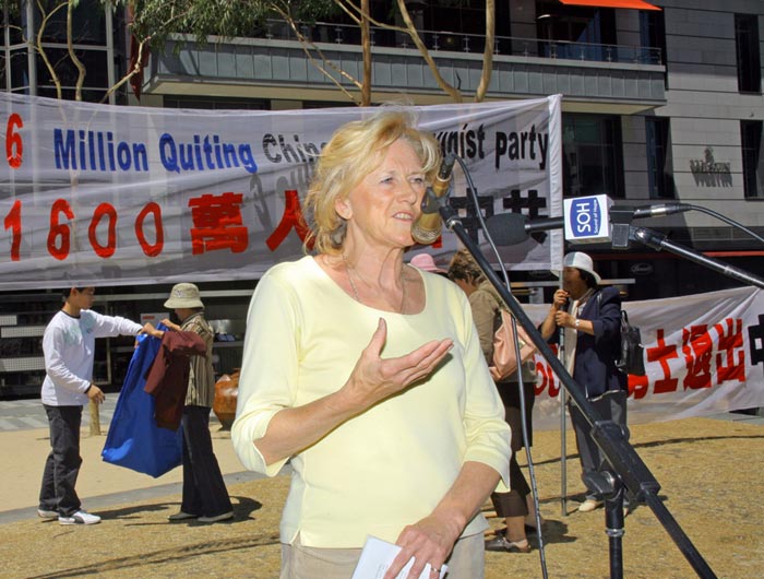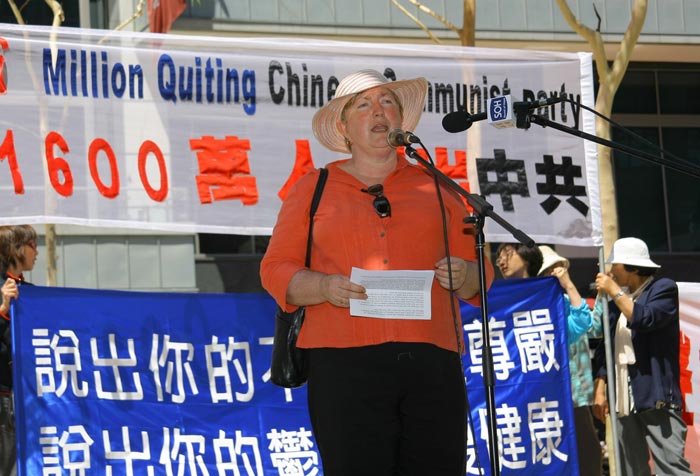 ![]() 澳赴大陆法轮功真相调查团(CIFPG)代表Leigh Smith女士在集会上发言 |